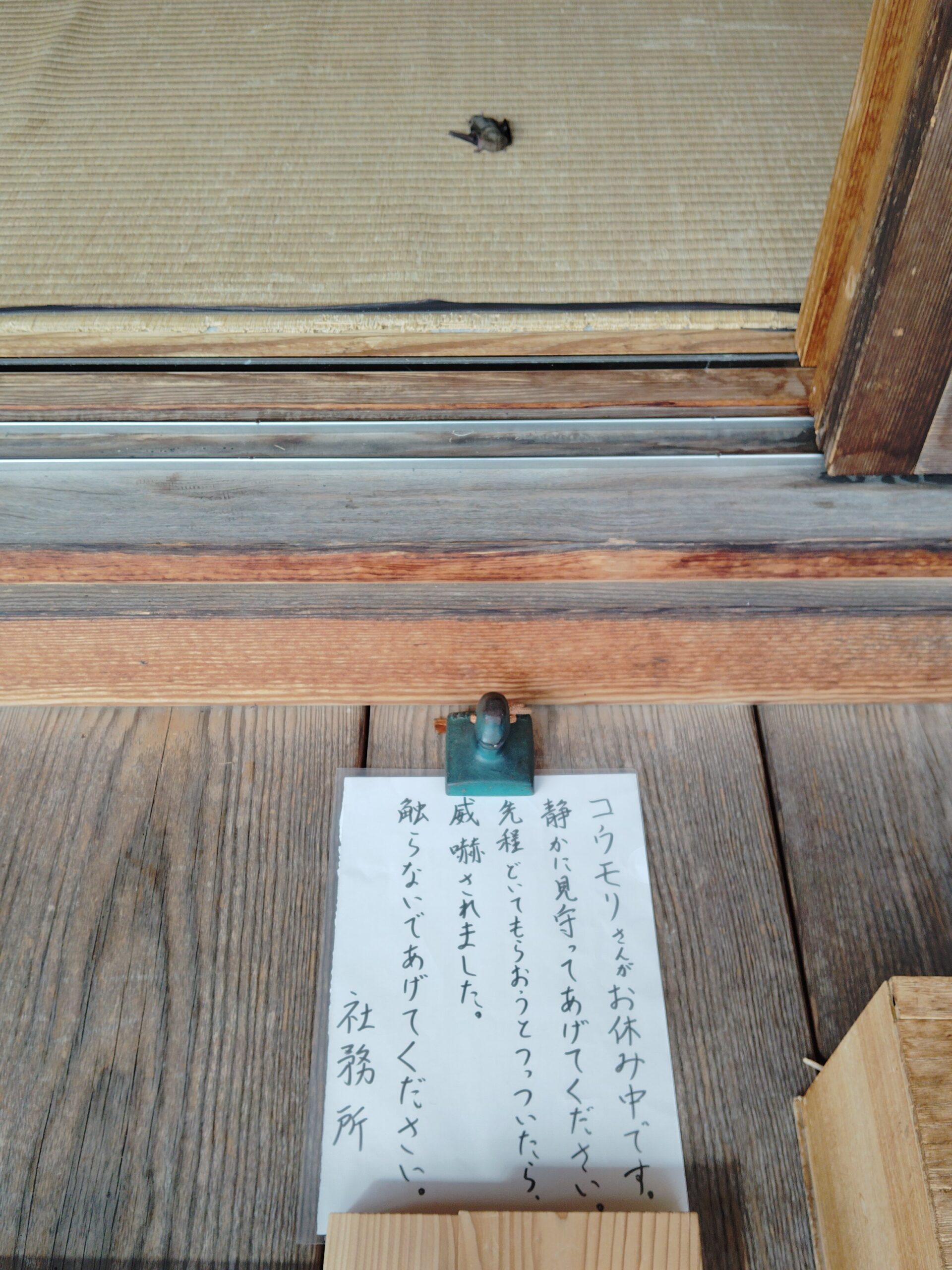 お参りの皆様におかれましては、お手を触れられませぬよう、ご注意ください(コウモリは、ウイルスや病原菌をたくさん持っていると言われています)。